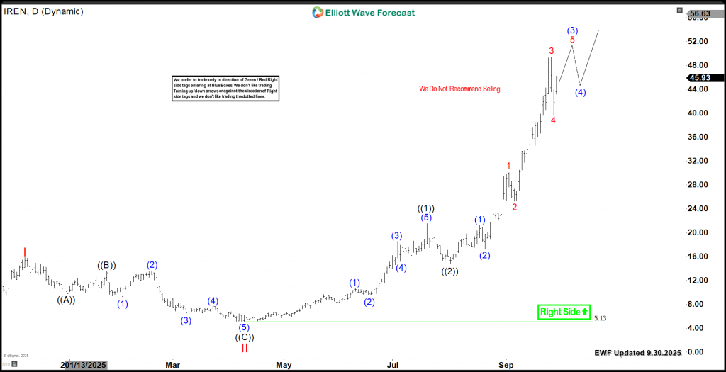 IREN’s explosive rally from its April 2025 low of $5.13 shows a clear 3-wave advance. This structure confirms an incomplete bullish daily cycle. The stock completed Wave ((1)) at $21.54, then corrected to $14.72 in Wave ((2)). Now, Wave ((3)) extends higher through a series of internal waves.