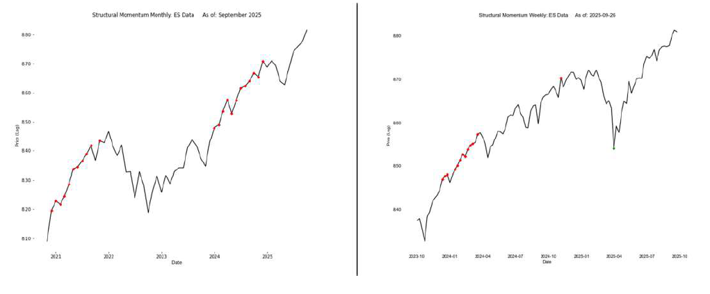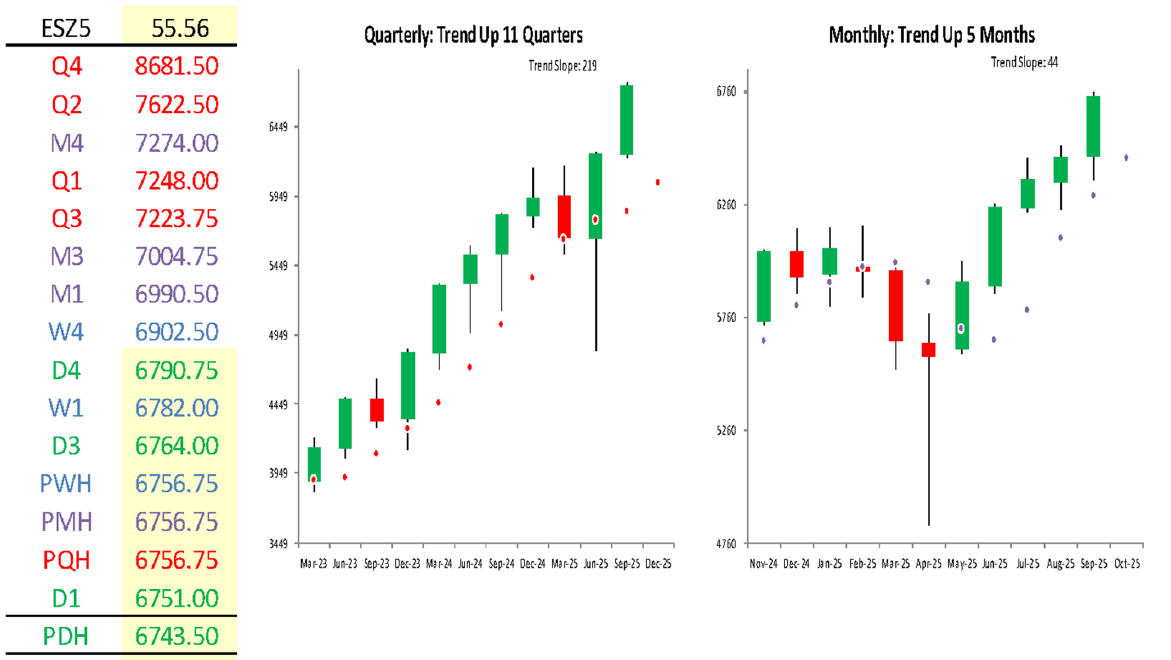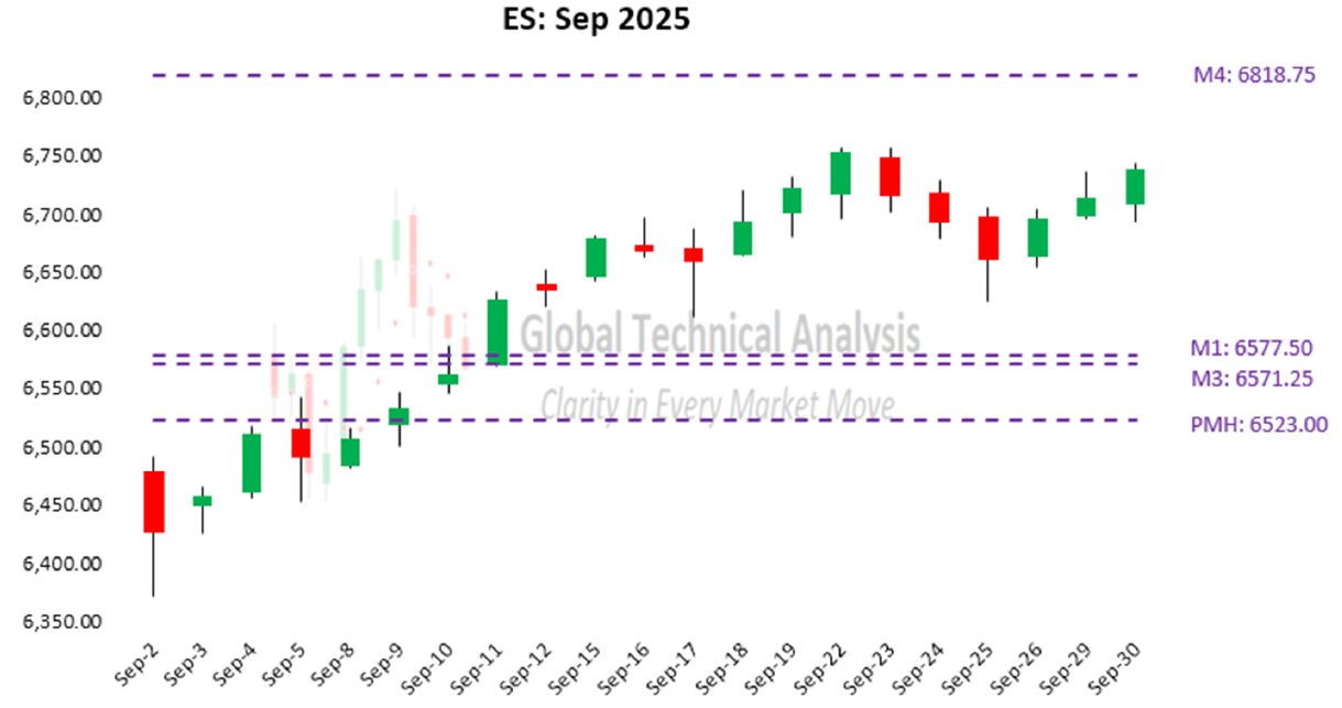 Figure 1 presents a candlestick chart illustrating daily price movements throughout September 2025. Support and resistance levels, identified using our methodology, are indicated by dashed lines. The market established the intra-month low at 6371.75 on September 2, remaining above the isolated support level at PML: 6239.50. Over the subsequent six trading sessions through September 10, the market advanced to, and briefly exceeded, the isolated pivot level at M1: 6577.50 but did not settle above it.
