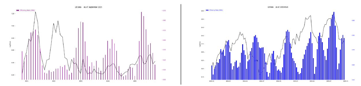 This metric gauges the ‘noise’ of market prices. A low ER reflects higher noise and a lack of trending behavior, while a high ER signals stronger trends. The Monthly Efficiency Ratio indicates that the rebound from the April low continues to gain strength. The Weekly Efficiency Ratio also indicates that the recent bullish trend is strengthening. For a detailed visual analysis, refer to Figure 4.