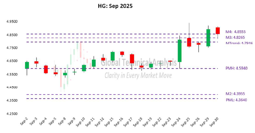 Figure 2 presents a candlestick chart illustrating daily price movements throughout September 2025. Support and resistance levels, identified through our methodology, are marked by dashed lines. The market opened the month near the previous month’s high at PMH: 4.5940, exceeding it on September 2 with a high of 4.6490. Over the subsequent four sessions through September 8, prices declined, establishing the intra-month low at 4.5255 while remaining above clustered support at M2: 4.3955 / PML: 4.3640.